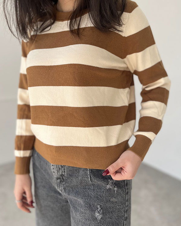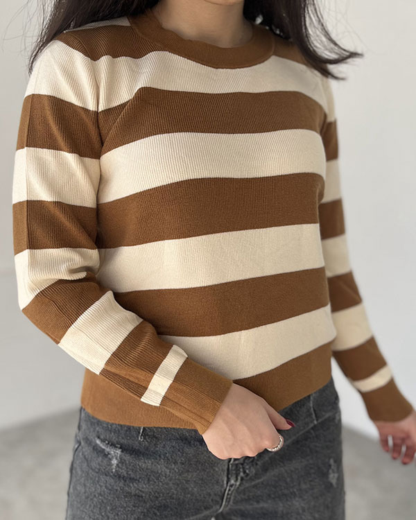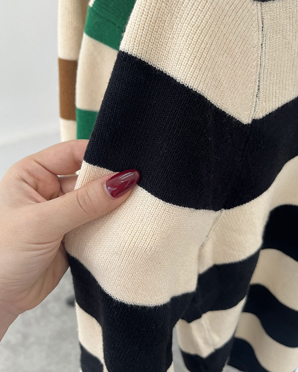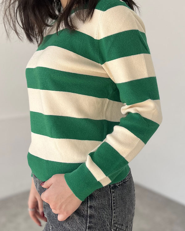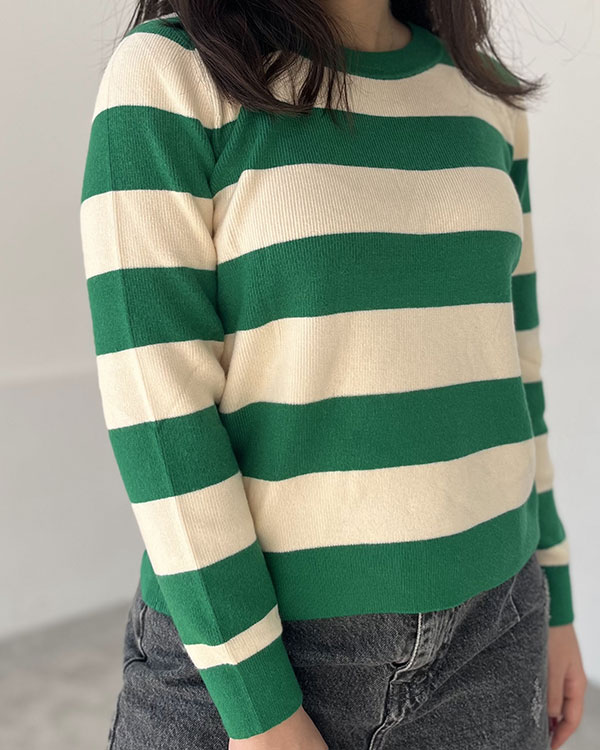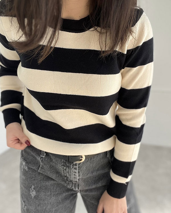از نظر استایل، میتوانید این بافت را با یک شلوار جین جذب و نیمبوت کوتاه بپوشید تا ظاهری اسپرت و جوانپسند داشته باشید، یا آن را با شلوار پارچهای و بوت بلند ترکیب کنید تا ظاهری شیکتر و رسمیتر بسازید. همچنین میتوانید برای تکمیل استایل زمستانیتان، روی آن یک پالتوی طوسی یا کرم بپوشید تا جلوهی رنگهای راهراه بیشتر به چشم بیاید.